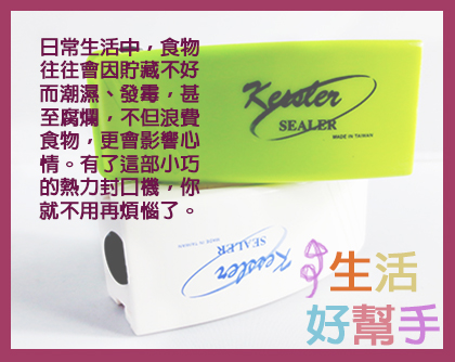 隨身封口機,攜帶方便,絕密封存,防菌、防潮、防氧化,保持新鮮! 適合密封零食、餐食、飾物、相片及遙控器等 操作及介紹影片: http://www.youtube.com/watch?v=hbNxMMGoClE 產品資料: 攜帶式封口機 材質:ABS 產地:台灣 顏色:綠, 白 外形尺寸:112×46×42mm 使用電池:2節5號(AA)電池 (必須使用鹼性電池) 使用方法:裝上電池(兩節五號),等三分鐘,金屬頭熱了就可以開始使用。夾住要封口的薄膜或是膠帶,按住一到三秒,再慢慢的移動,十分簡單。 產品介紹 可保鮮、密封、收納、防潮、防塵;攜帶方便、不佔空間。 現代人愈來愈有健康概念,對拆封後未食用完的食品,利用攜帶式封口機便可將原來的塑膠包裝袋再次密封,可讓食品能保有原來的新鮮度,不怕吃到不新鮮的食品;同時也不必另外再用塑膠袋來收納保存,可減少資源浪費。 攜帶式封口機機只需兩顆三號鹼性電池,輕鬆劃過,即可將各種塑膠袋封口密合,食物保鮮、防潮防塵更輕而易舉,無論日常家用、辦公室、外出旅皆能輕鬆應用。 <產品用途>●保存:零食、乾糧、重要文件、任何拆封後未用完的食品,皆能完整保存防變質,讓您愛吃多少就吃多少。 ●保鮮:蔬果肉類分裝,衛生又乾淨。 ●收納:小至藥品、飾品、零配件;大至衣物、棉被皆能完整收納,防塵又整齊。 ●密封:居家用品、乾溼食物,皆能完全密封。 ●安全:防護蓋裝置 <使用步驟> 注意事項 使用完畢請妥善放置,勿讓兒童把玩,以免發生危險。 電池耗弱供電不足時將無法密封,請即更換電池(2顆3號鹼性電池)。 使用中前端發熱體將產生高熱,禁止觸摸:長時間收納時建議將電池取出。 適用0.2mm以下的塑膠袋包裝,鋁箔袋及較厚的塑膠袋需按壓較長時間並確認密封是否完全。 封口機勿在原地按壓過久,請持續移動完成封口,以免塑膠袋過熱熔化。