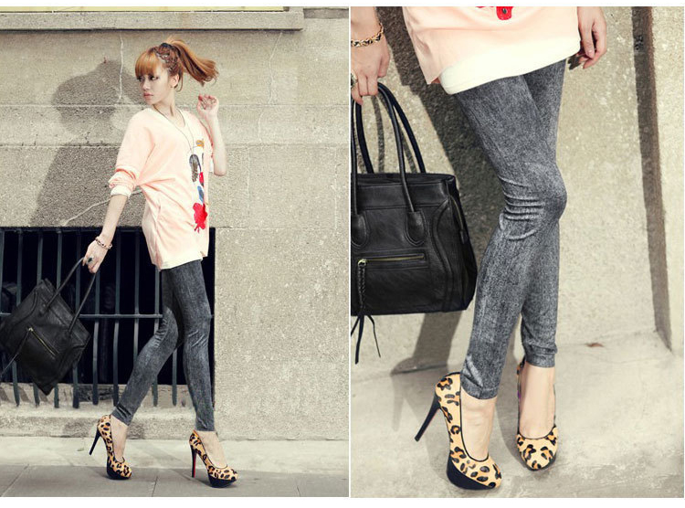 韓版高彈力仿牛仔打底裤 春夏九分褲--雪花牛仔(黑色)